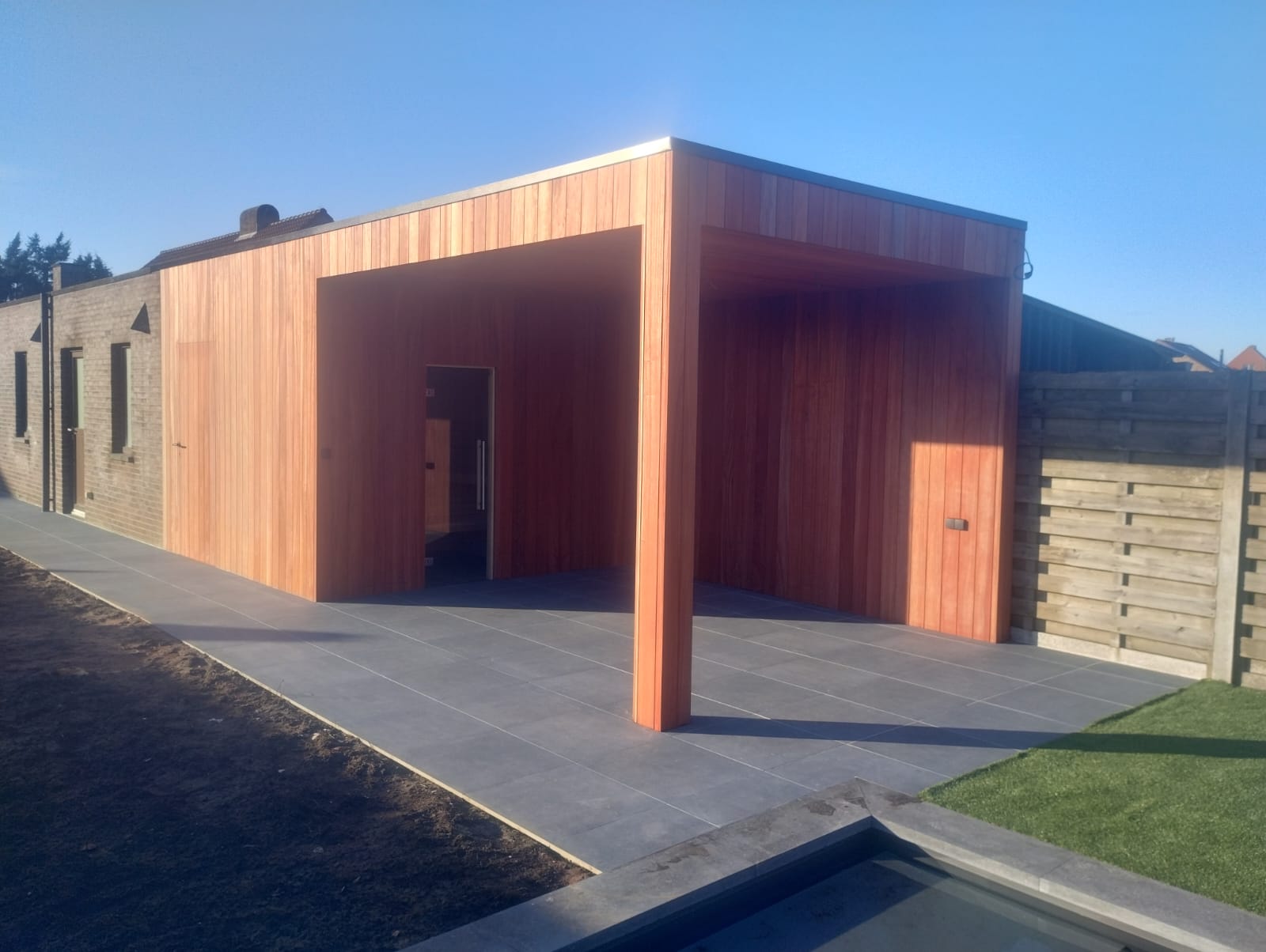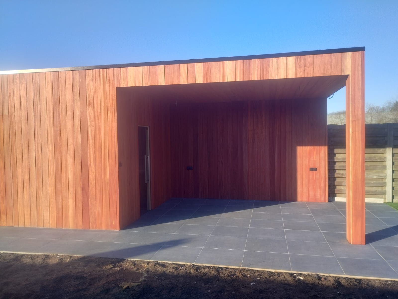 Ook de achtergevel van deze carport werkten we af, inclusief een overdekte tuinberging.
